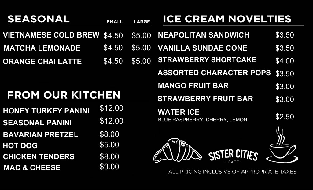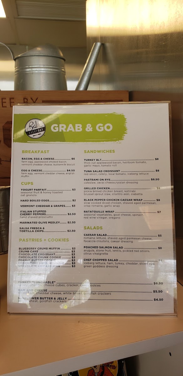 Overall, the menu at Sister Cities Café offers a well-rounded and approachable selection that feels both casual and thoughtfully curated. Breakfast staples like Bacon, Egg & Cheese and Egg & Cheese provide comforting, no-fuss options to start the day, while lighter cups such as the Yogurt Parfait, Hard Boiled Eggs, and Vermont Cheddar & Grapes add variety. The sandwich lineup stands out with satisfying choices like the Turkey BLT, Tuna Salad Croissant, and Pastrami on Rye, alongside heartier picks like Grilled Chicken and the flavorful Black Pepper Chicken Caesar Wrap. For something fresh, salads such as the Caesar Salad, Poached Salmon Salad, and Chef Chopped Salad round out the menu nicely. The pastry case, featuring treats like the Blueberry Crumb Muffin, Crumb Cake, Chocolate Croissant, Chocolate Chunk Cookie, and Peanut Butter Cookie, adds a sweet finish, while kid-friendly options like the Turkey "Lunchable", Ham and Cheese, and Sunflower Butter & Jelly make it accessible for families. Altogether, the menu delivers a balanced mix of classic café fare with enough variety to satisfy different tastes.